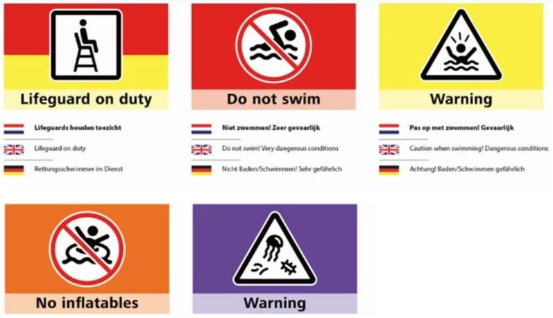- Various flags in different colours and designs along the shore indicate if and where it is safe to swim in the sea. Note: these beach flags (‘strandvlaggen’) are only displayed at places where rescue teams are on duty. Familiarise yourself with the flags in the diagrams below, and their extended versions on the site of the national rescue agency. If you see no flag at the coast, be wise and extra careful.